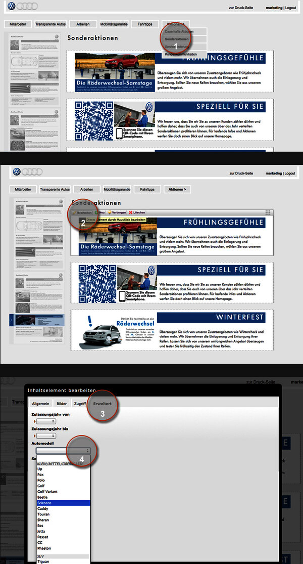 Unter dem Menüpunkt „Admin-Seite“ gelangen Sie zu Ihrer betriebsindividuellen Seite. Hier haben Sie die Möglichkeit, unter dem Menüpunkt „Aktionen“ ihre betriebseigene Aktion einzustellen. Wo diese Aktion eingestellt wird, bestimmen Sie, indem Sie zwischen „Dauerhafte Aktion“, Serviceföderung“, „Kundenkommunikation“ und „ Sonderaktion“ wählen. Wenn Sie den Ort der Aktion festgelegt haben, klicken Sie bitte auf der Seit oben rechts auf „Text und Bilder“. Sobald Sie diesen anklicken erscheint im Aktionsbereich der Hinweis „Inhaltselement einfügen“. Ziehen Sie den Button auf dieses Feld (Drag and Drop). Sobald es gelb wird, lassen Sie die Maus los. Nun steht Ihnen Ihr neues Inhaltselement zur Verfügung. Gehen Sie nun mit der Maus auf das erstellte Inhaltselement. An der oberen Kante erscheint eine Bearbeitungsleiste. Klicken Sie auf den Button „bearbeiten“. Durch ein Popup Fenster öffnet sich nun Ihr Inhaltselement. Betiteln Sie als erste die Aktion in dem Feld „Überschrift“, dann legen Sie in „Text“ den Text fest. Anschließend wählen Sie in der Kartei „Bilder“ oben rechts aus. Klicken Sie auf das Ordnersymbol. Es öffnet sich ein weiteres Popup-Fenster. Wählen Sie zunächst durch anklicken der „Aktionen“ den Ort aus, wo das Bild gespeichert werden soll. Jetzt können Sie Ihr betriebseigenes Bild laden. Klicken Sie den Button „durchsuchen“ und wählen Sie in Ihren betriebsinternen Dateien ein geeignetes Bild. Klicken Sie auf „öffnen“ und anschließend in Ihrem Popup-Fenster auf „hochladen“. Sobald das Bild geladen ist, finden Sie es rechts unten im Popup-Fenster. Hier finden Sie auch die vom AUDI/VW Marketing vorgegebenen Bildkampagnen, von denen Sie sich ebenfalls Bilder aussuchen können. Klicken Sie nun Ihr gewünschtes an. Gehen Sie in Ihrem Inhaltselement auf „speichern“. Sie finden nun in der Leistungsübersicht und dem gewählten Aktionsbereich Ihre Aktion mit Text und Bild, die Sie nun für die Leistungsübersicht verwenden können.