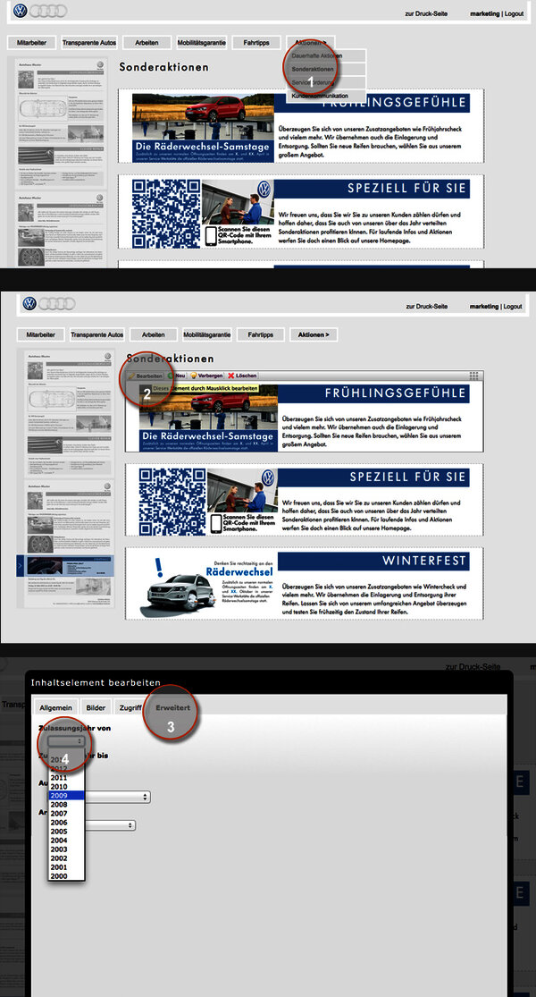 Ihre Inhaltslemente (selbsterstellten Aktionen) bieten Ihnen verschiedene Funktionen an. Zu allererst gehen Sie bitte in Ihrer Admin-Seite auf die gewünschte Aktion und klicken Sie auf „bearbeiten“ (näheres zum Erstellen von Aktionen finden Sie unter Frage 2). Möchten Sie Ihre Aktion nur für bestimmte Baujahre freigeben, dann können Sie das unter dem Menüpunkt „erweitert“ oben als letzten Punkt unter den Karteikarten. Hier finden Sie die Felder „Zulassung von“ und „Zulassung bis“. Geben Sie hier die gewünschten Baujahre für diese Aktion ein und klicken Sie anschließend auf „speichern“. Ihre Aktion wird nun nur für diese Baujahre als Auswahl in Ihrer Leistungsübersicht angeboten.